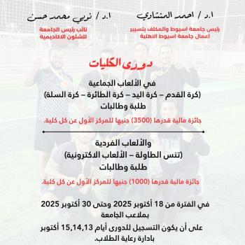 تنظم جامعة أسيوط الأهلية دوري كليات الجامعة للعام الجامعي 2025/2026 في مختلف الألعاب…