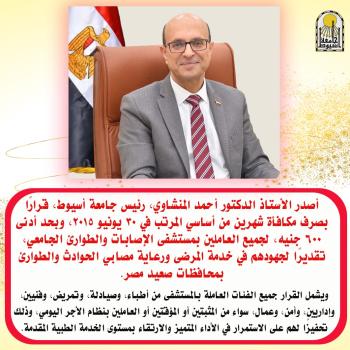 قرر الدكتور أحمد المنشاوي، رئيس جامعة أسيوط، صرف مكافأة مالية قدرها شهرين من أساسي المرتب في 30 يونيو 2015، وبحد أدنى 600 جنيه، لجميع العاملين بمستشفى الإصابات والطوارئ…