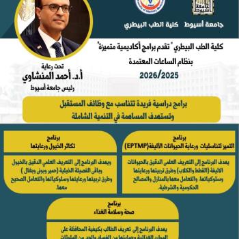 تحت رعاية الدكتور أحمد المنشاوي رئيس جامعة أسيوط، أعلنت كلية الطب البيطري عن طرح ثلاثة برامج دراسية بنظام الساعات المعتمدة (بمصروفات دراسية) لمرحلة البكالوريوس، وذلك…