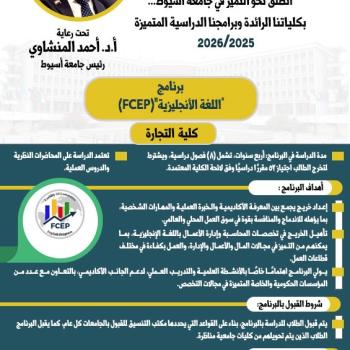 أعلنت كلية التجارة بجامعة أسيوط عن طرح برنامج اللغة الإنجليزية (FCEP) للعام الجامعي 2025/2026، والذي يُعد من…