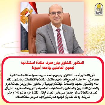 قرر الدكتور أحمد المنشاوي، رئيس جامعة أسيوط، صرف مكافأة استثنائية لجميع العاملين بالجامعة بمختلف الكليات والقطاعات والوحدات، وذلك تقديراً لجهودهم في الاستعداد للعام…