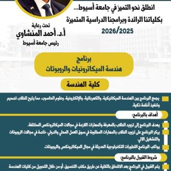 أعلنت كلية الهندسة بجامعة أسيوط عن إطلاق برنامج "هندسة الميكاترونيات والروبوتات"…