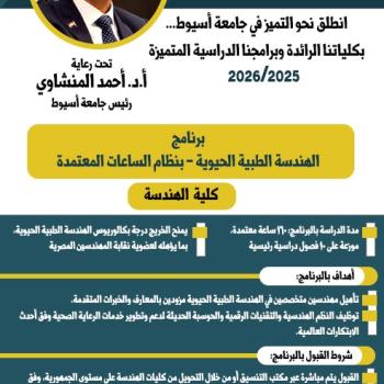 أعلنت كلية الهندسة بجامعة أسيوط عن إطلاق برنامج "الهندسة الطبية الحيوية" بنظام الساعات المعتمدة، وذلك اعتبارًا من العام الجامعي…
