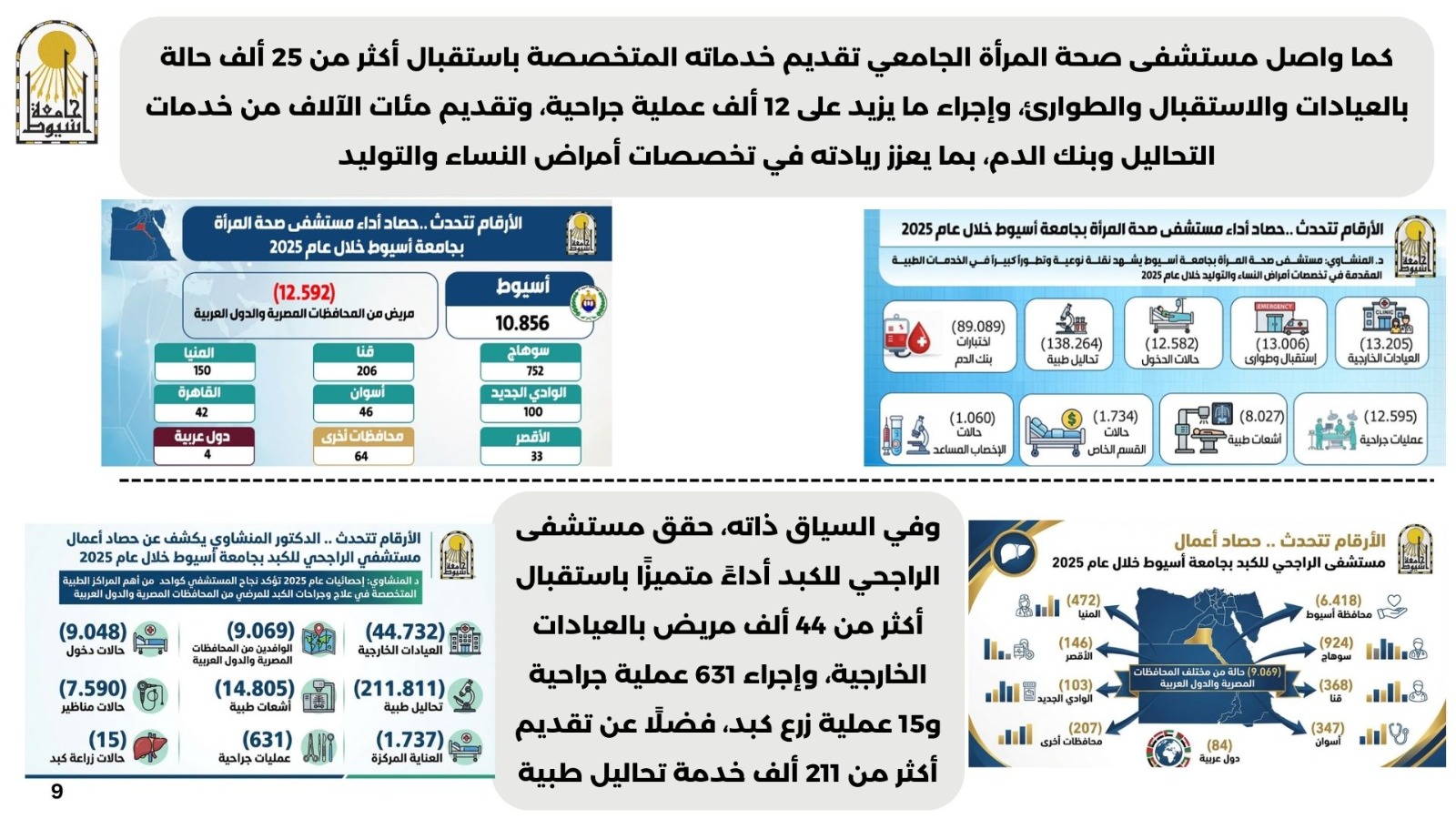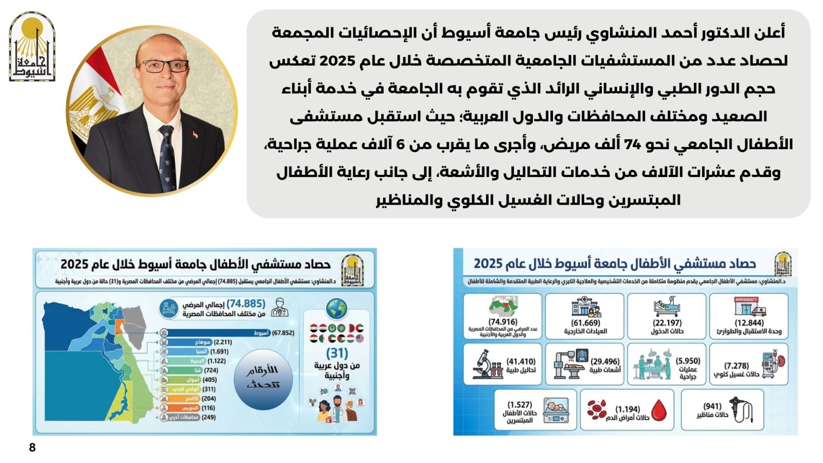 • أعلن الدكتور أحمد المنشاوي رئيس جامعة أسيوط أن الإحصائيات المجمعة لحصاد عدد من المستشفيات الجامعية المتخصصة خلال عام 2025 تعكس حجم الدور الطبي والإنساني الرائد الذي تقوم به الجامعة في خدمة أبناء الصعيد ومختلف المحافظات والدول العربية؛ حيث استقبل مستشفى الأطفال الجامعي نحو 74 ألف مريض، وأجرى ما يقرب من 6 آلاف عملية جراحية، وقدم عشرات الآلاف من خدمات التحاليل والأشعة، إلى جانب رعاية الأطفال المبتسرين وحالات الغسيل الكلوي والمناظير. كما واصل مستشفى صحة المرأة الجامعي تقديم خدماته المتخصصة باستقبال أكثر من 25 ألف حالة بالعيادات والاستقبال والطوارئ، وإجراء ما يزيد على 12 ألف عملية جراحية، وتقديم مئات الآلاف من خدمات التحاليل وبنك الدم، بما يعزز ريادته في تخصصات أمراض النساء والتوليد. وفي السياق ذاته، حقق مستشفى الراجحي للكبد أداءً متميزًا باستقبال أكثر من 44 ألف مريض بالعيادات الخارجية، وإجراء 631 عملية جراحية و15 عملية زرع كبد، فضلًا عن تقديم أكثر من 211 ألف خدمة تحاليل طبية. بينما استقبل مستشفى القلب الجامعي ما يزيد على 42 ألف مريض، وأجرى 4,398 عملية قسطرة و1,399 جراحة قلب وصدر، مؤكدًا مكانة مستشفيات جامعة أسيوط كأكبر منظومة طبية متكاملة في صعيد مصر تعمل وفق أعلى معايير الجودة العالمية.
