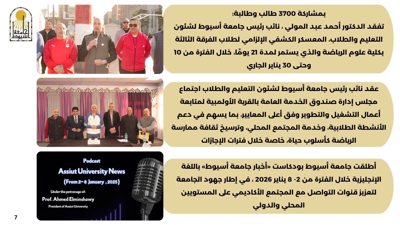 • أطلقت جامعة أسيوط بودكاست «أخبار جامعة أسيوط» باللغة الإنجليزية خلال الفترة من 2- 8 يناير 2026 ، في إطار جهود الجامعة لتعزيز قنوات التواصل مع المجتمع الأكاديمي على المستويين المحلي والدولي