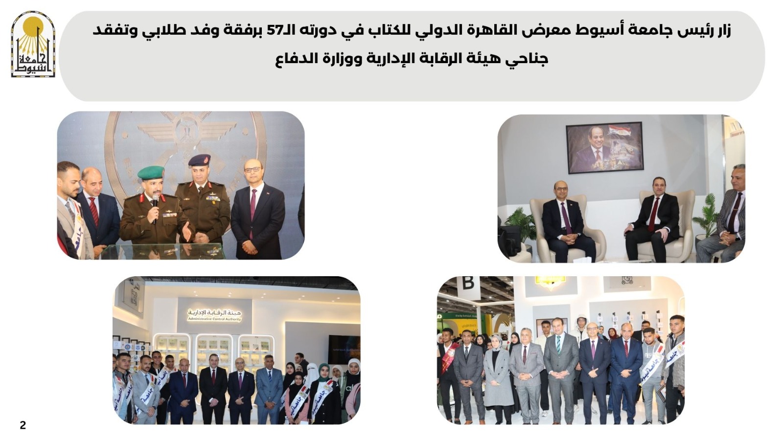 • زار رئيس جامعة أسيوط معرض القاهرة الدولي للكتاب في دورته الـ57 برفقة وفد طلابي وتفقد جناحي هيئة الرقابة الإدارية ووزارة الدفاع.