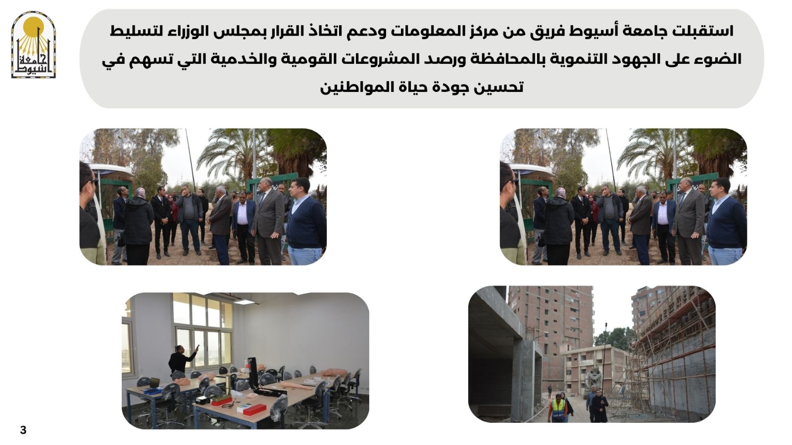 • استقبلت جامعة أسيوط فريق من مركز المعلومات ودعم اتخاذ القرار بمجلس الوزراء لتسليط الضوء على الجهود التنموية بالمحافظة ورصد المشروعات القومية والخدمية التي تسهم في تحسين جودة حياة المواطنين.