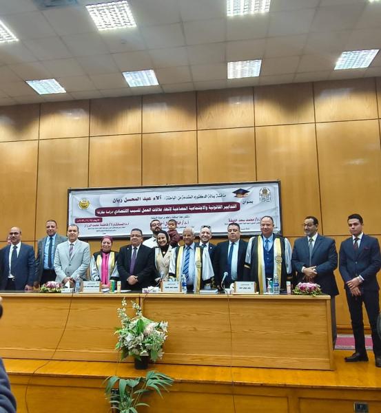 ومن جانبه، أوضح الدكتور دويب حسين صابر أن كلية الحقوق تواصل دورها في إعداد كوادر قانونية متميزة، لافتًا إلى أن الرسالة تمثل إضافة علمية مهمة للمكتبة القانونية، لما تتناوله من موضوعات تمس استقرار علاقات العمل.
