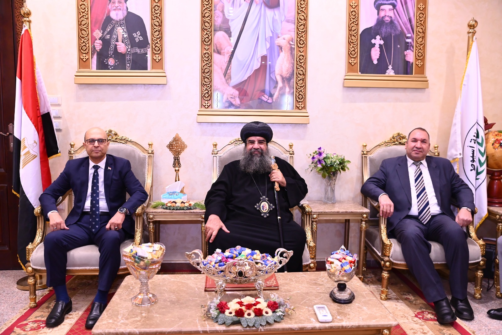 الدكتور أحمد المنشاوي رئيس جامعة أسيوط يزور مقر مطرانية أبنوب والفتح وأسيوط الجديدة لتهنئة قداسة الأنبا بيسنتي بعيد القيامة المجيد