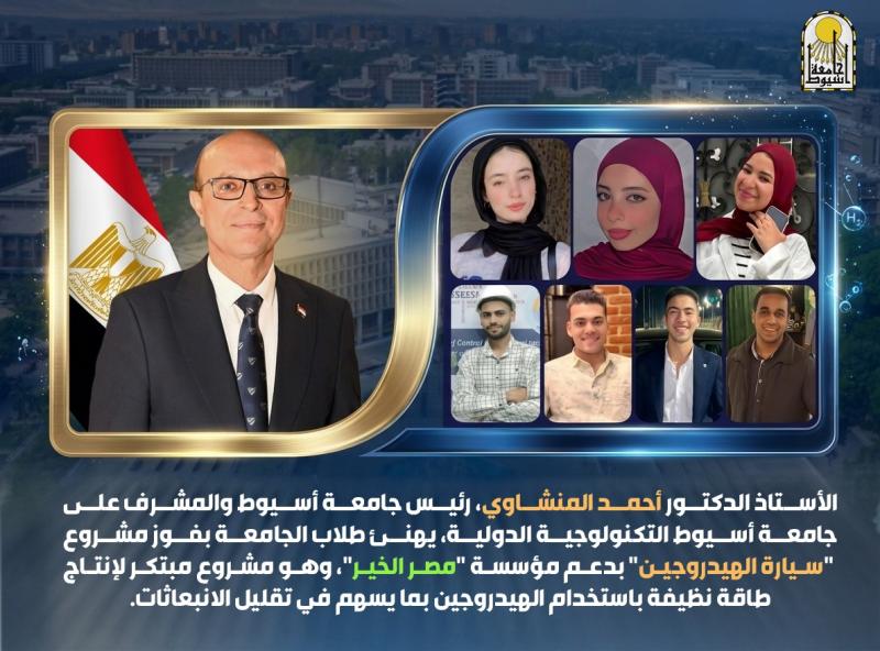 الدكتور المنشاوي يهنئ طلاب جامعة أسيوط التكنولوجية الدولية بفوز مشروع "سيارة الهيدروجين" بدعم مؤسسة "مصر الخير"