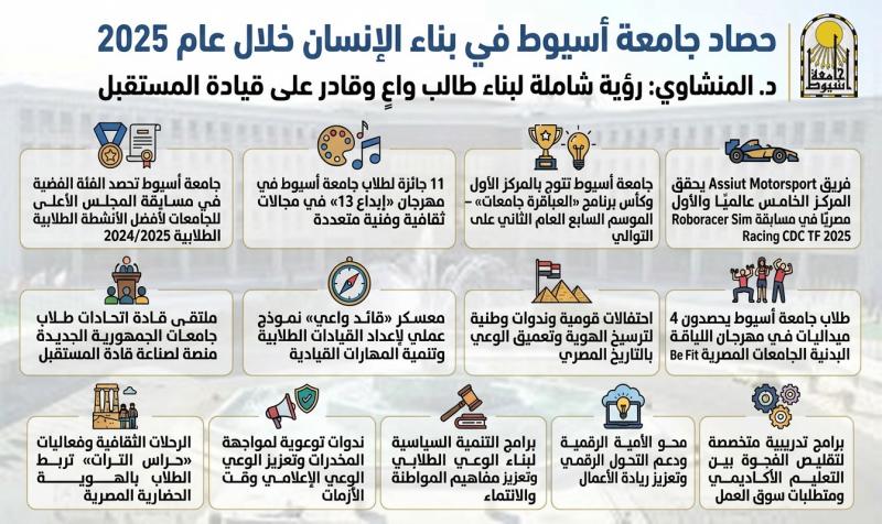 تحت رعاية الدكتور أحمد المنشاوي رئيس جامعة أسيوط، وبإشراف الدكتور أحمد عبد المولى نائب رئيس الجامعة لشئون التعليم والطلاب، واصلت جامعة أسيوط خلال عام 2025 أداء دورها الوطني والتنموي في مجال بناء الإنسان، الذي يمثل أحد المحاور الرئيسية للجمهورية الجديدة، واضعة الطالب الجامعي في صدارة أولوياتها باعتباره حجر الأساس في عملية التنمية الشاملة وبناء المستقبل.