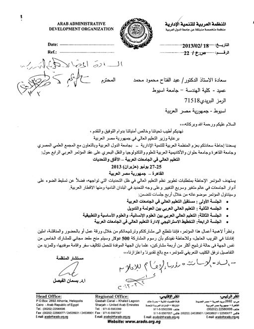 عقد المؤتمر العربى الرابع حول التعليم العالى فى الجامعات العربية ( الآفاق - التحديات ) 5 مارس 2013 عقد المؤتمر العربى الرابع حول التعليم العالى فى الجامعات العربية ( الآفاق - التحديات )