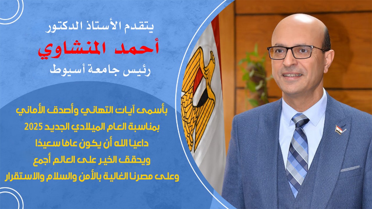 هنأ الدكتور أحمد المنشاوي رئيس جامعة أسيوط، فخامة الرئيس عبدالفتاح السيسي، رئيس الجمهورية، بالأصالة عن نفسه، وبالإنابة عن أسرة الجامعة؛ بمناسبة قرب حلول العام الميلادي الجديد 2025. أعاده الله علينا- جميعاً- باليمن، والخير، والبركات، وعلى مصرنا الحبيبة؛ بالتقدم، والازدهار.