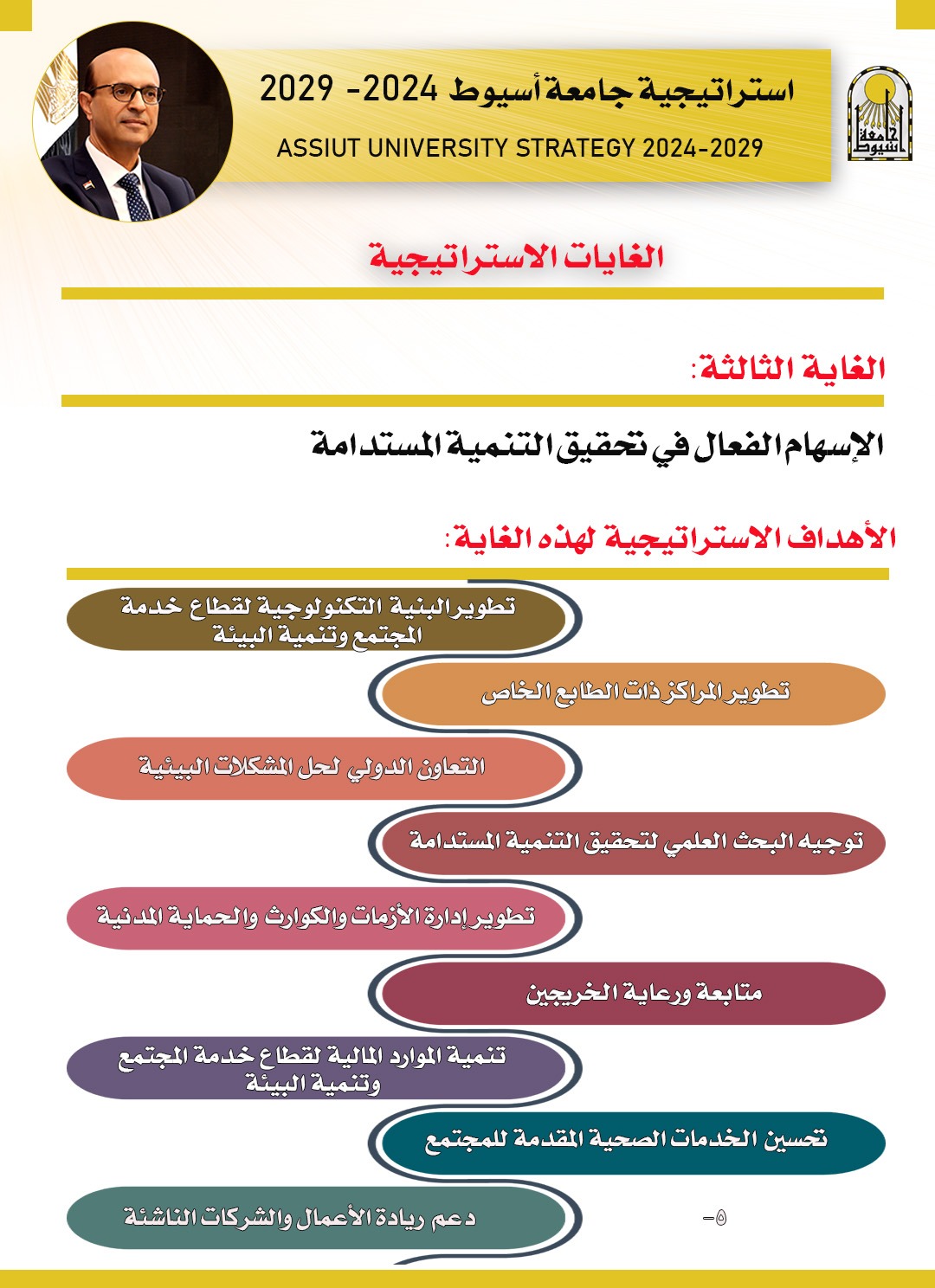 كشف الدكتور أحمد المنشاوي رئيس الجامعة، عن غايات استراتيجية جامعة أسيوط (2024 -2029)؛ لتطوير قطاع خدمة المجتمع وتنمية البيئة، وذلك لتحقيق التنمية المستدامة، مؤكداً أن الاستراتيجية تركز على النظام البيئي، وتشجيع البحث العلمي في مجال الاستدامة، والحفاظ على البيئة؛ ترسيخاً لدور الجامعة في العديد من محاور التنمية، وتكامل خطة الجامعة التعليمية، والبحثية، مع رؤية مصر الاستراتيجية 2030، وذلك من خلال تحقيق عدد من الأهداف، وهي: