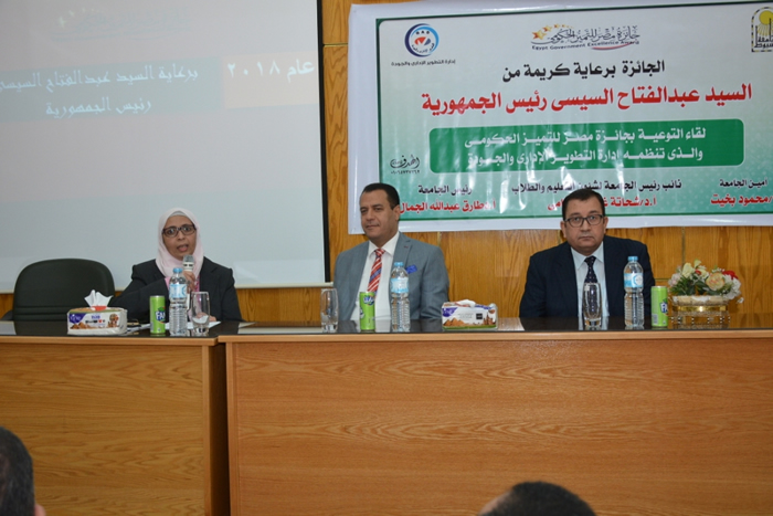 جاء ذلك خلال افتتاح فاعليات " لقاء التوعية بجائزة مصر للتمييز الحكومى و الذى تنظمه إدارة التطوير الادارى و الجودة فى كلية الحاسبات بالجامعة ، و ذلك تحت رعاية الدكتور طارق الجمال رئيس الجامعة ، وبحضور الدكتورة تيسير حسن عبد الحميد عميدة كلية الحاسبات و المعلومات ، والدكتور مرغنى حسن وكيل الكلية لشئون التعليم و الطلاب و الأستاذ محمود بخيت أمين عام الجامعة و الأستاذ محمد عباس مدير إدارة التطوير الادارى و الجودة ومنسق الجائزة بالجامعة ، ولفيف من السادة أعضاء هيئة التدريس و العاملين بكلية الحاسبات .