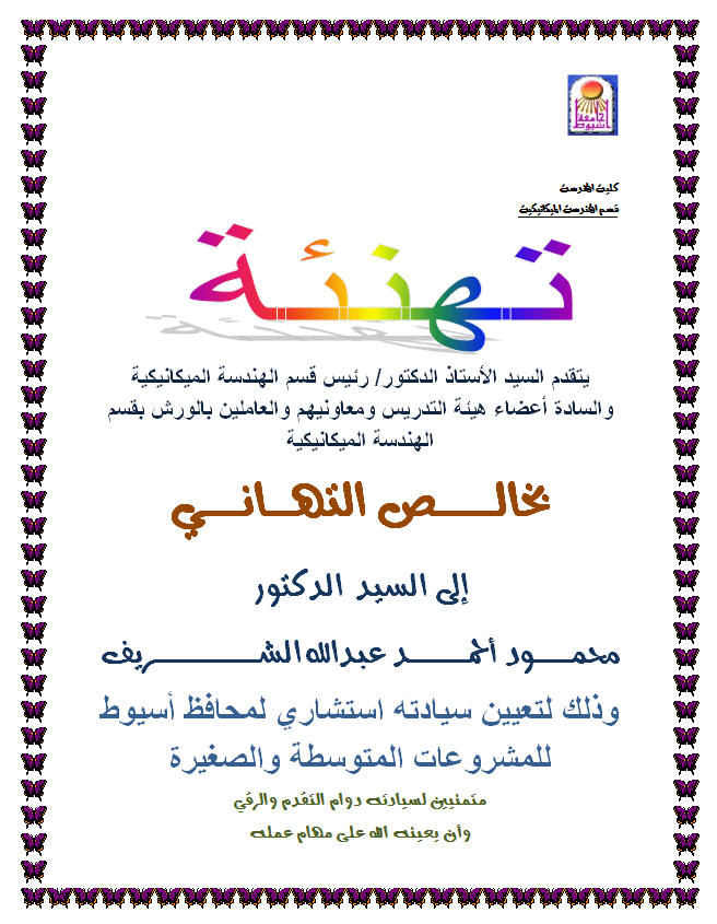 تهنئه خاصة من الأستاذ الدكتور رئيس قسم الهندسة للدكتور/ محمود الشريف بمناسبة تعيين سيادتة استشارى لمحافظ أسيوط 27 فبراير 2013 تهنئه خاصة من الأستاذ الدكتور رئيس قسم الهندسة للدكتور/ محمود الشريف بمناسبة تعيين سيادتة استشارى لمحافظ أسيوط