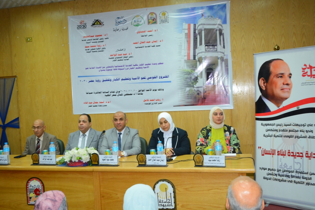 تحت رعاية الدكتور أحمد المنشاوى رئيس جامعة أسيوط، نظّمت وحدة تعليم الكبار بكلية الخدمة الإجتماعية، بالتعاون مع الهيئة العامة لمحو الأمية، وتعليم الكبار/ فرع أسيوط، ندوة توعوية عن "المشروع القومى لمحو الأمية، وتعليم الكبار، وتحقيق رؤية مصر 2030" تحت إشراف الدكتور محمود عبدالعليم نائب رئيس الجامعة لشئون خدمة المجتمع، وتنمية البيئة، والدكتورة إيمان عبدالعال عميد الكلية.