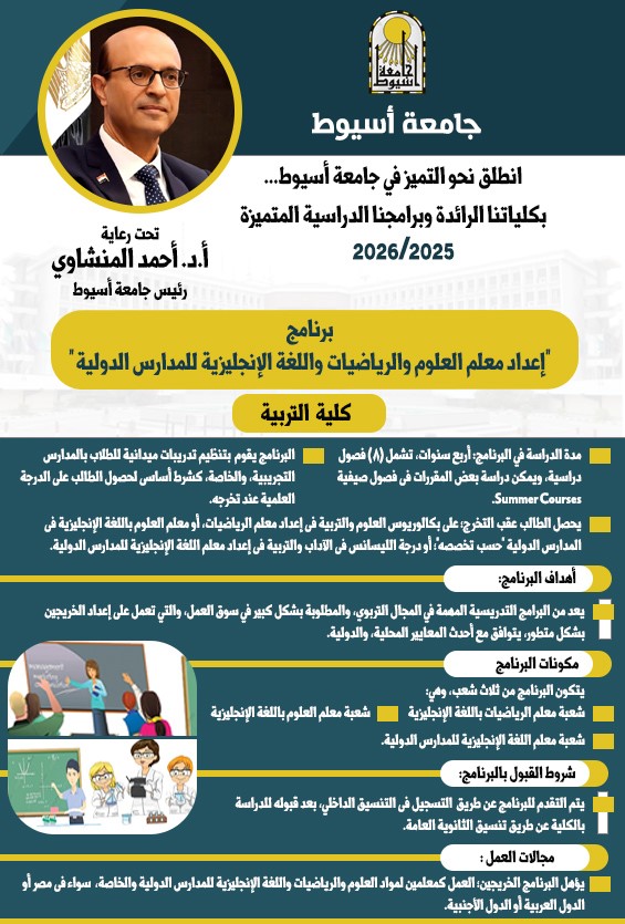 أوضح الدكتور أحمد المنشاوي، رئيس جامعة أسيوط، أن برنامج إعداد معلم العلوم والرياضيات واللغة الإنجليزية للمدارس الدولية بكلية التربية يمثل إضافة نوعية مميزة، لما يتميز به من خصوصية في إعداد كوادر تعليمية مؤهلة للتدريس باللغة الإنجليزية وفق أحدث المعايير المحلية والدولية، وهو ما يجعله من البرامج الرائدة التي تلبي احتياجات المدارس الدولية والخاصة داخل مصر وخارجها، مشيرًا إلى أن الجامعة تحرص من خلال هذا البرنامج على إعداد خريجين قادرين على المنافسة في سوق العمل المحلي والإقليمي والدولي.