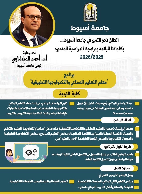 تربية أسيوط تطلق برنامج "معلم التعليم الصناعي والتكنولوجيا التطبيقية" للعام الجامعي 2025/2026