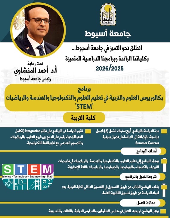 تربية أسيوط تطرح برنامج "بكالوريوس العلوم والتربية في تعليم العلوم والتكنولوجيا والهندسة والرياضيات STEM" للعام الجامعي 2025/2026