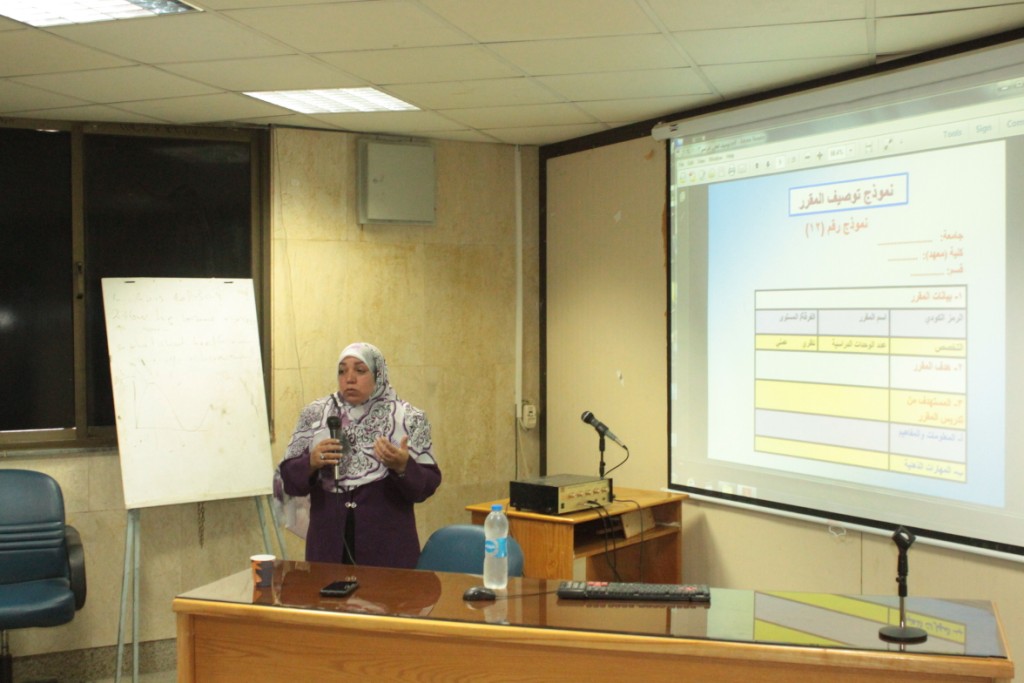 وناقشت الدكتورة إكرام إبراهيم محمد، خلال محاضرتها؛ عدداً من المحاور المهمة منها: وظائف التوصيف، ومكونات التوصيف، ةتوصيف المقرر الدراسي، ومراحل وتصميم المقرر، ونموذج توصيف المقرر والذي يتضمن: بيانات المقرر، وهدف المقرر، المستهدف من تدريس المقرر، ومحتوي المقرر، وأساليب التعليم والتعلم، وأساليب التعليم والتعلم للطلاب ذوي القدرات المحدودة، وتقويم الطلاب، وقائمة الكتب الدراسية والمراجع، وتقرير المقرر الدراسي، ونموذج خريطة المنهج علي مستوي المقرر.