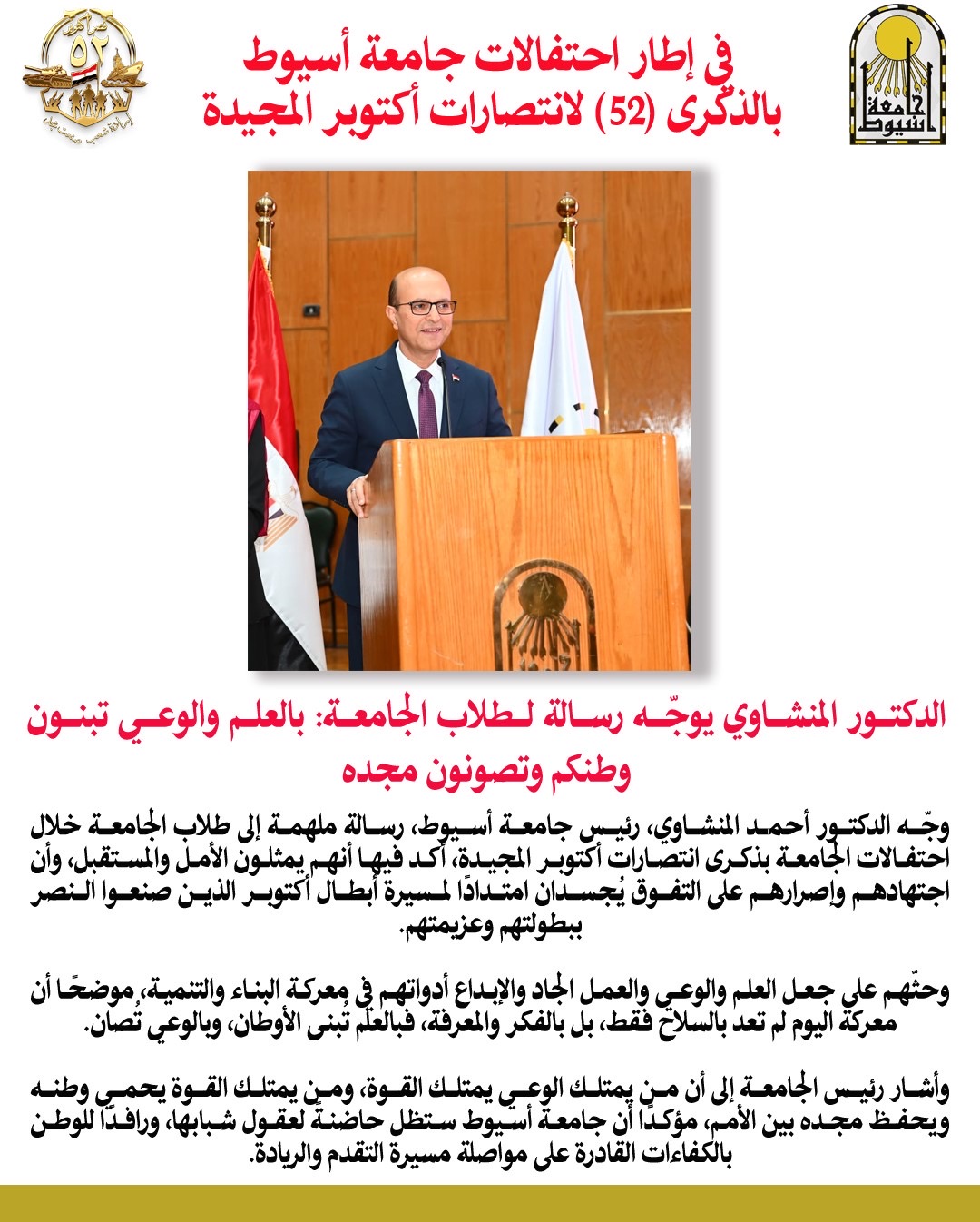 وجّه الدكتور أحمد المنشاوي، رئيس جامعة أسيوط، رسالة إلى طلاب الجامعة خلال احتفالات الجامعة بذكرى انتصارات أكتوبر المجيدة، أكد فيها أنهم يمثلون الأمل والمستقبل، وأن اجتهادهم وإصرارهم على التفوق يُجسدان امتدادًا لمسيرة أبطال أكتوبر الذين صنعوا النصر ببطولتهم وعزيمتهم.