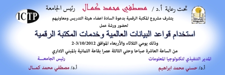 نحيط سيادتكم علماً بأن إدارة مشروع تطوير نظم وتكنولوجيا المعلومات ومشروع المكتبات الرقمية قد قرر إرسال فريق من المتخصصين لعقد دورة تدريبية على إستخدام قواعد البيانات للسادة أعضاء هيئة التدريس والهيئة المعاونه وأخصائى المكتبات والمعلومات بجامعة اسيوط لذا نتشرف بدعوة سيادتكم لحضور الدورة التدريبة وذلك على مدار يومى الثلاثاء 2/10/2012 والاربعاء 3/10/2012 من الساعة العاشرة صباحاً بقاعة المؤتمرات بالمبني الاداري على أن يكون جدول التدريب كما يلى :- |