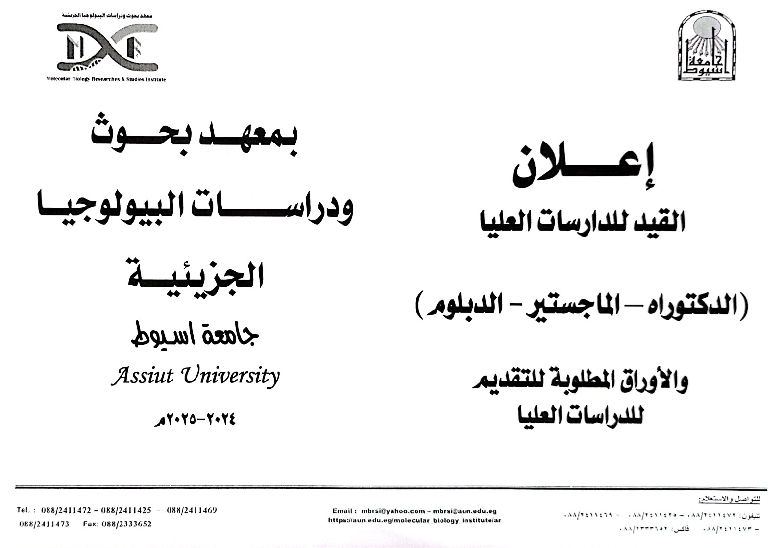 يعلن معهد بحوث ودراسات البيولوجيا الجزيئية عن فتح باب التقدم للقيد فى الدراسات العليا 31 يوليو 2024 يعلن معهد بحوث ودراسات البيولوجيا الجزيئية عن فتح باب التقدم للقيد فى الدراسات العليا لدرجات لدرجات الدبلوم - الماجيستير - والدكتوراه طبقا للمعايير والشروط الاتية