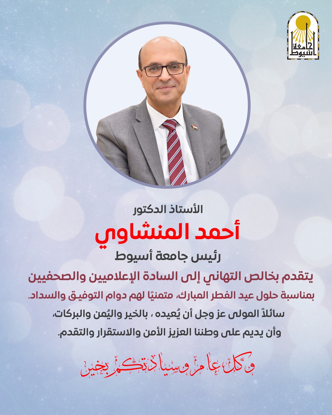 يتقدم الأستاذ الدكتور أحمد المنشاوي، رئيس جامعة أسيوط، بأصدق التهاني وأطيب التمنيات لحضراتكم جميعًا بمناسبة عيد الفطر المبارك. سائلاً الله أن يعيده عليكم بالخير واليمن والبركات، وأن يوفقكم دائمًا في أداء رسالتكم الإعلامية السامية لخدمة وتنمية المجتمع.