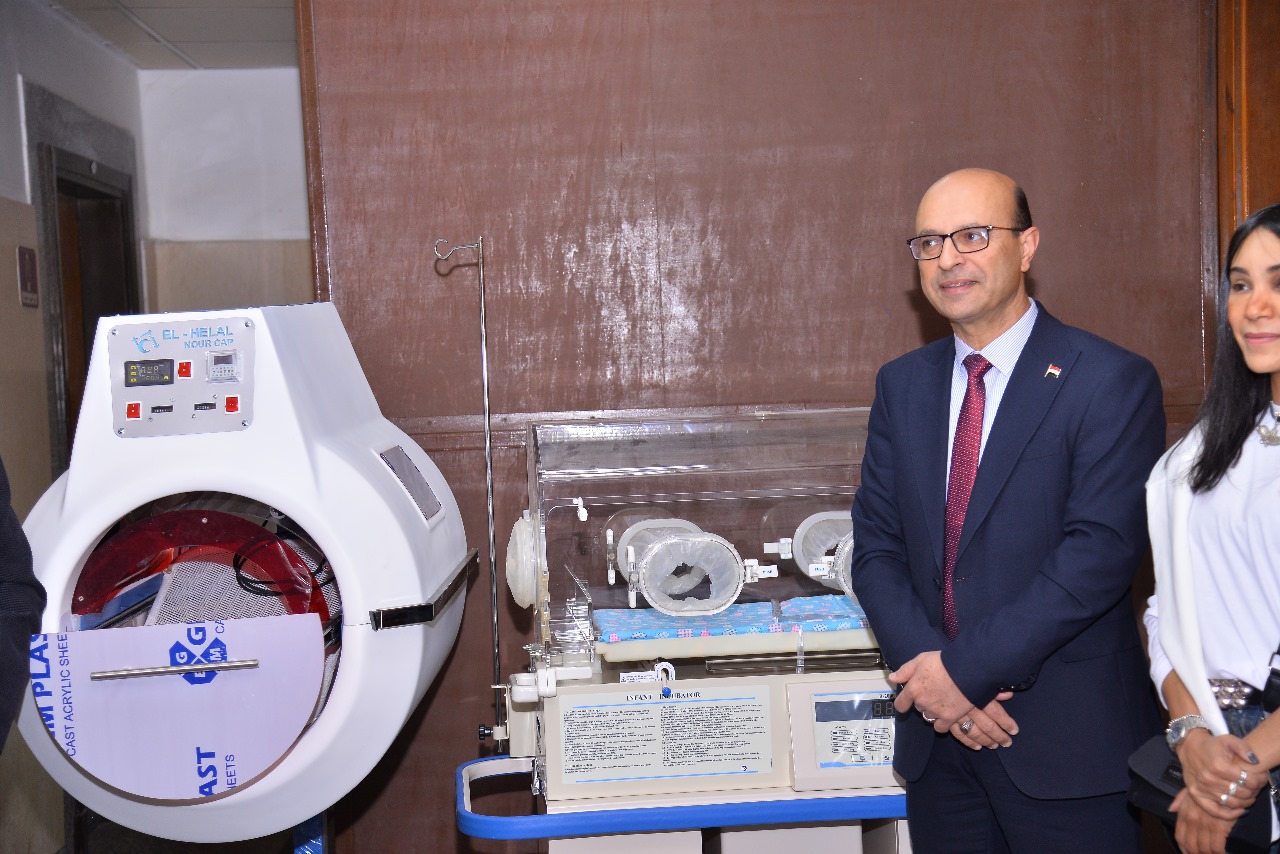 - Prof. Ahmed El-Minshawy explained that the medical devices provided by the Arab African International Bank included (38) electric chairs for children, (12) incubators with their accessories, (2) capsules, and (2) bile machines to serve premature babies in the hospital, in addition to (2) dialysis machines, noting that these devices and medical equipment represent an important addition to the University Children's Hospital to contribute to improving medical and therapeutic services for children and newborns.