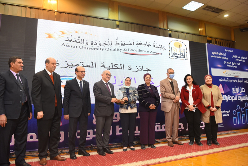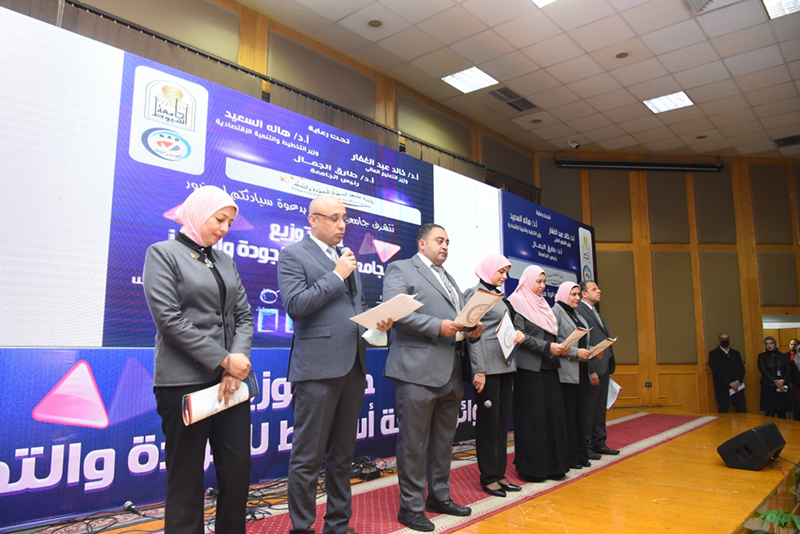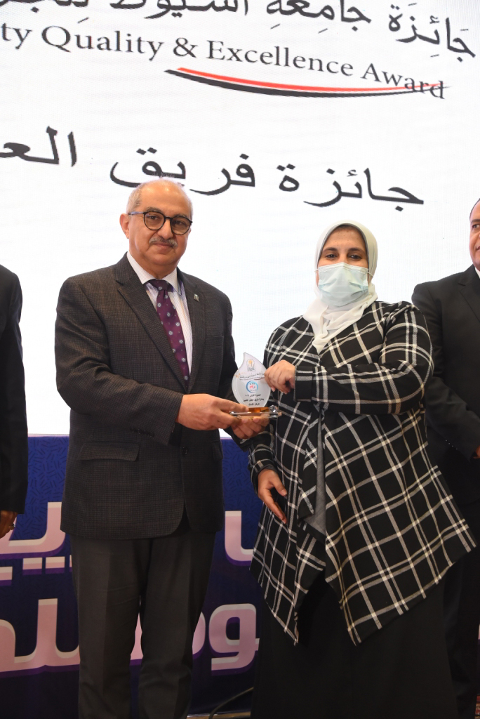 Dr. Tarek El-Gammal stated that the aim of the award is to raise the level of services provided by the university’s administrative apparatus. This is done by developing and optimally utilizing its human resources in support of institutional competitiveness and the satisfaction of the university’s customers and employees. Thus, this award spreads a culture of quality and excellence among members of the administrative body, as well as encourages the spirit of creativity among employees to provide their best. The stages of preparation for the award, that were launched in May 2021, began with holding a series of awareness-raising events and workshops, launching a website for the award, and activating the WhatsApp service to receive inquiries. These events included 17 colleges and public administrations. Mr. Muhammad Abbas explained that the ceremony witnessed the university administration honoring the colleges and units that won the university’s awards for quality and excellence. The ceremony included announcing the winning of the faculty of Pharmacy first place in the distinguished website award, the faculty of Nursing in second place, and the faculty of Physical Education in third place.