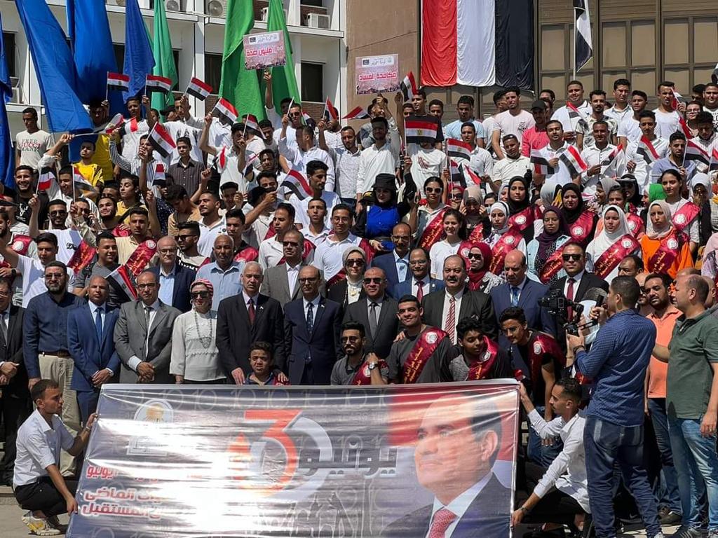 In commemoration of the tenth anniversary of the June 30 Revolution, Assiut University organized a community march today, the first in a series of commemorative events scheduled for July 2023. The theme of this anniversary is "Ten Years After the June 30 Revolution: Repercussions of the Past and Prospects for the Future."