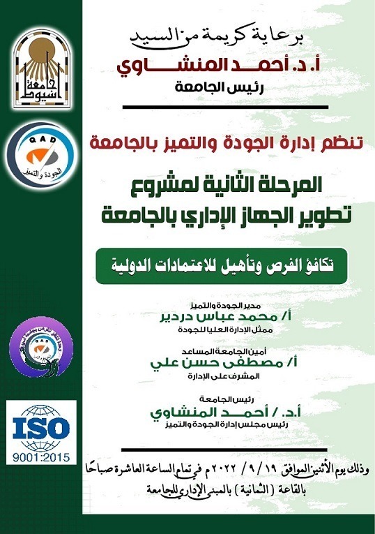 Assiut University President states that the second phase of the project to develop the university's administrative system comes in line with Egypt's strategy for sustainable development (Egypt Vision 2030) and government excellence standards, which is also scheduled to include the launch of the work of the Unit for Equal Opportunities and Empowerment of Women and People with Special Needs, affiliate to the Quality and Excellence Department to raise efficiency of the university's administrative system.