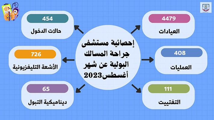 The hospital recorded 726 cases in the Radiology Department, 454 cases were hospitalized in the internal departments, 408 surgical operations were performed, 111 cases were received in the Lithotripsy Unit and 65 in THE Urodynamics Unit during the same month.