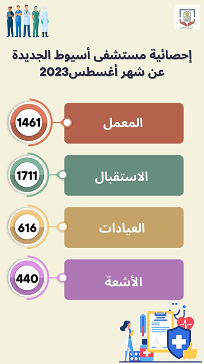 The New Assuit University Hospital recorded 1711 cases in the Reception Unit last August under the auspices of Prof. Ahmed Al-Minshawi, President of Assuit University; Prof. Alaa Atiya, Dean of the Faculty of Medicine and Chairman of the Board of Directors of University Hospitals; Prof. Ihab Fawzy, Executive Director of University Hospitals; and Prof. Zakaria Mohamed Abdel-Sadek, Manager of the Hospital.