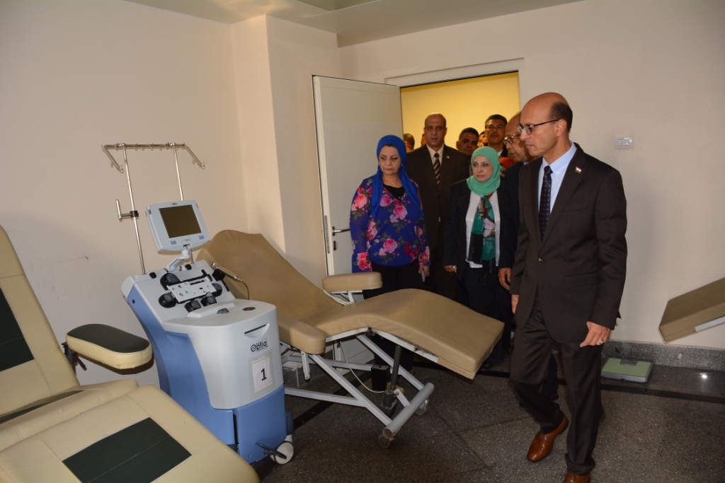 During the tour, the president examined the bone-marrow-transplantation unit, which is the largest of its kind in Upper Egypt. It consists of five well-equipped transplantation cabins, and two care rooms accommodating four patients. The president also inspected the central monitoring unit and control rooms. Moreover, he announced that the institute, after six-month stoppage (mean time to repair), is preparing three cases for bone-marrow transplantation. Dr. El-Minshawy also praised the medical staff, trained locally and internationally, who are exerting tireless efforts to develop the level of service provided to patients