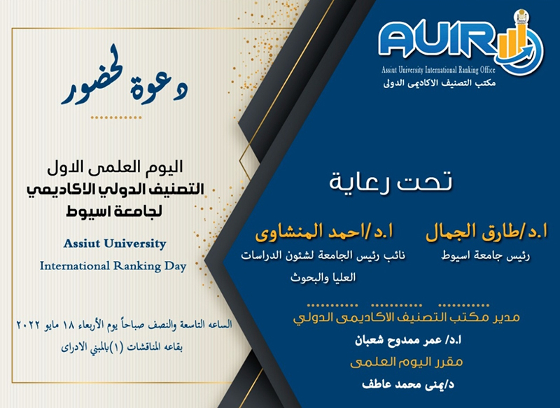 Dr. Ahmed Al-Manshawi, Vice-Chancellor of Assiut University for Postgraduate and Research Affairs, announced the first scientific day of the University's International Academic Classification Office on Wednesday under the auspices of Dr. Tariq Al-Jamal, President of the University, in order to contribute to the achievement of the vision of the University, which seeks to reach a world class.