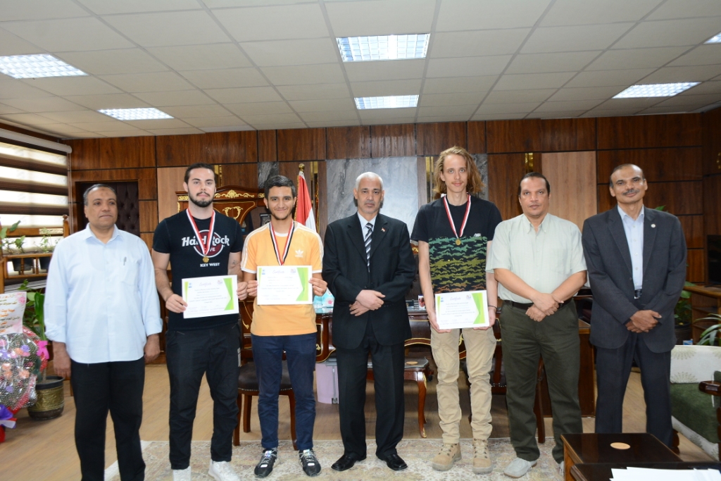 During the meeting, Prof. Ahmed Abdel -Mawli explained that the visit of the student delegation comes within the framework of scientific training in the student research unit at Assiut University in conjunction with the student exchange program in the field of pharmaceutical research in August, as he honored three international students and gave them Certificates of appreciation and medal in honor of them, those students are Nicolas, Mohamed and Kamil, from France and Poland.