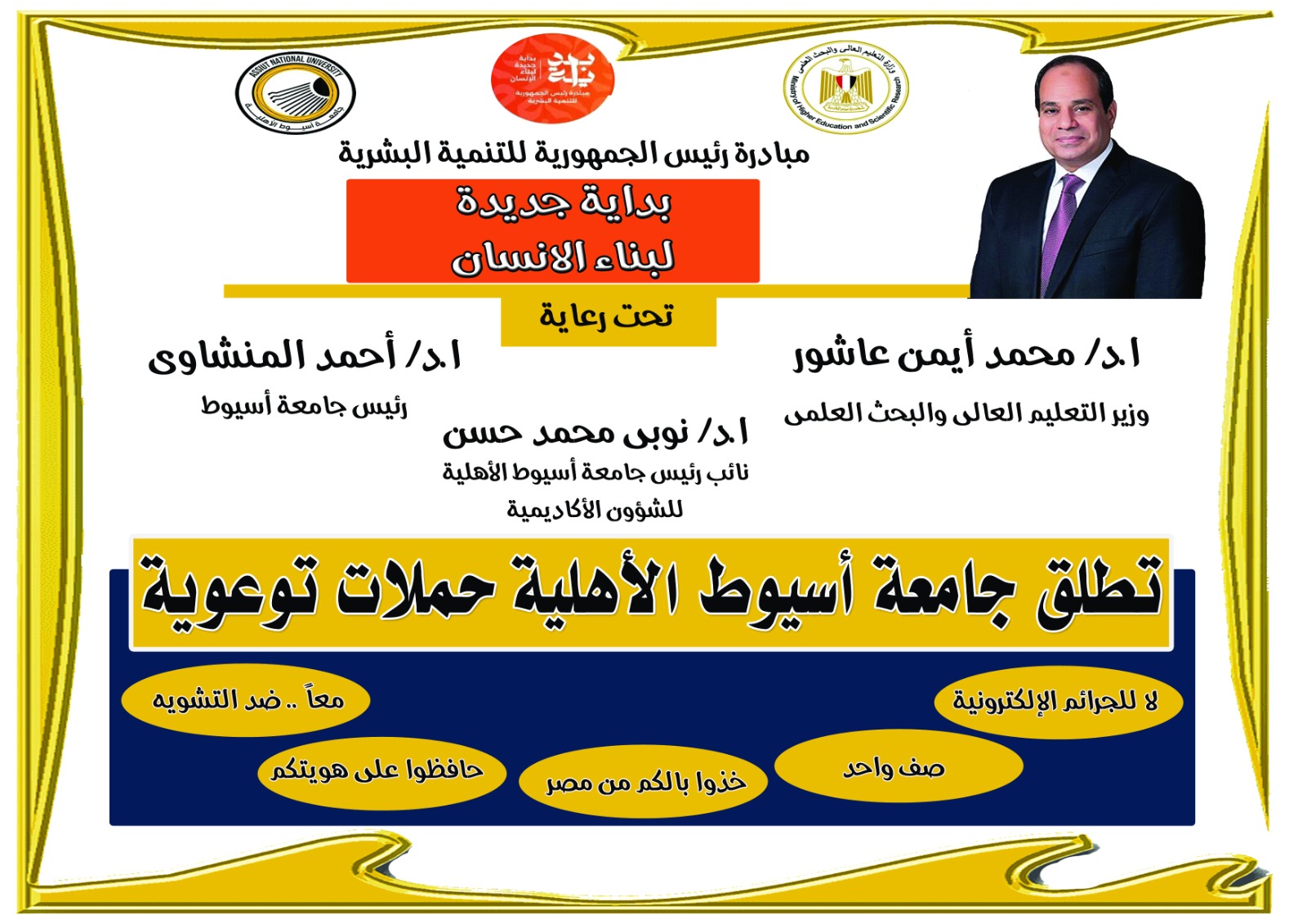Believing in the trends of the Egyptian state towards the development of human beings in all fields, Assiut National University launched a series of awareness campaigns on the dangers of the fourth and fifth-generation wars within the activities of the Presidential Initiative (a new beginning; to build the human being), as a contribution to enhance awareness among its students, and keen to participate in this important strategic step towards achieving the state plan for sustainable development in comprehensive concept.