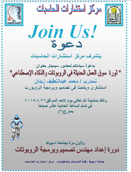 "Recent labor market revolution in robotics and artificial intelligence."Coach / Mohammed Abdul Latif ZidaneConsultant and researcher in the design and programming AlrobortThat runway (2) on Sunday, 04.26.2015 time (11:00)For the first time at the University of AssiutPreparation of design and programming robots engineer cycle