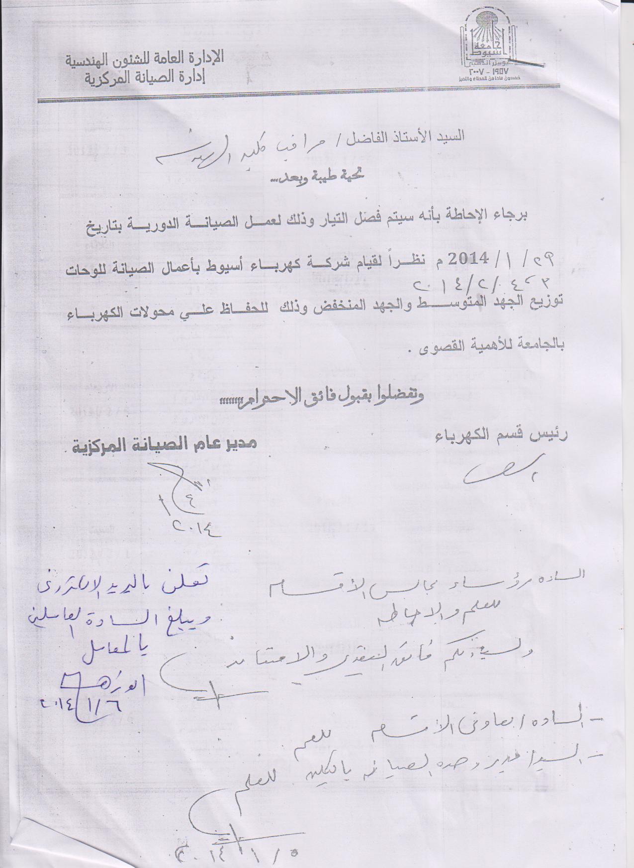 The Maintenance Schedule in Assiut University 9 January 2014 The electricity will be cut off on wednesday 29-1-2014 due to regular maintenance for the units.