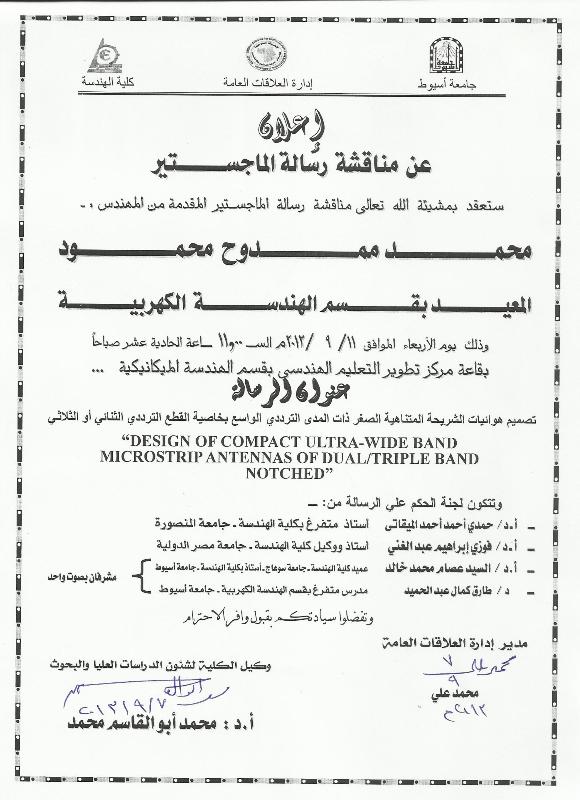 The electrical engineering department has approved to form a jury committee to evaluate the master thesis proposed by eng Muhammad Mamdouh Mahmoud on Wednesday 11-9-2013 in the Education Development Center in the mechanical deparment.The thesis is entitled: "Design of Compact Ultra-Wide Band Microstrip Antennas of Dual-Triple Band Notched."