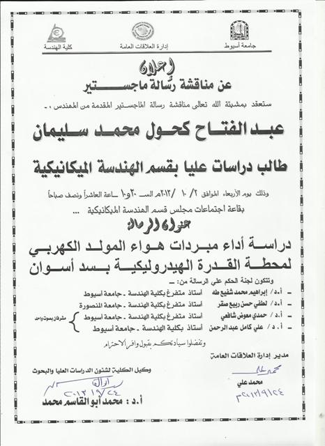 The mecahnical engineering department has approved to form a jury committee to evaluate the master thesis proposed by eng Abd El-Fattah Kahool Muhammad Soliman (postgraduate student) on Wednesday 2-10-2013 at 10.30 a.m. in the dicussion hall of the mechanical department.