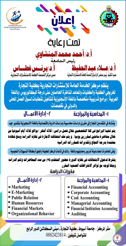أعلن مركز الخدمة العامة للاستشارات التجارية والتنمية الإدارية بجامعة أسيوط، عن عقد سلسلة من الدورات التدريبية المتخصصة، تحت رعاية الدكتور أحمد المنشاوي رئيس جامعة أسيوط، والدكتور علاء عبد الحفيظ عميد كلية التجارة ورئيس مجلس إدارة مركز الخدمة العامة للاستشارات التجارية، والدكتور برنس غطاس مدير مركز الخدمة العامة للاستشارات التجارية.