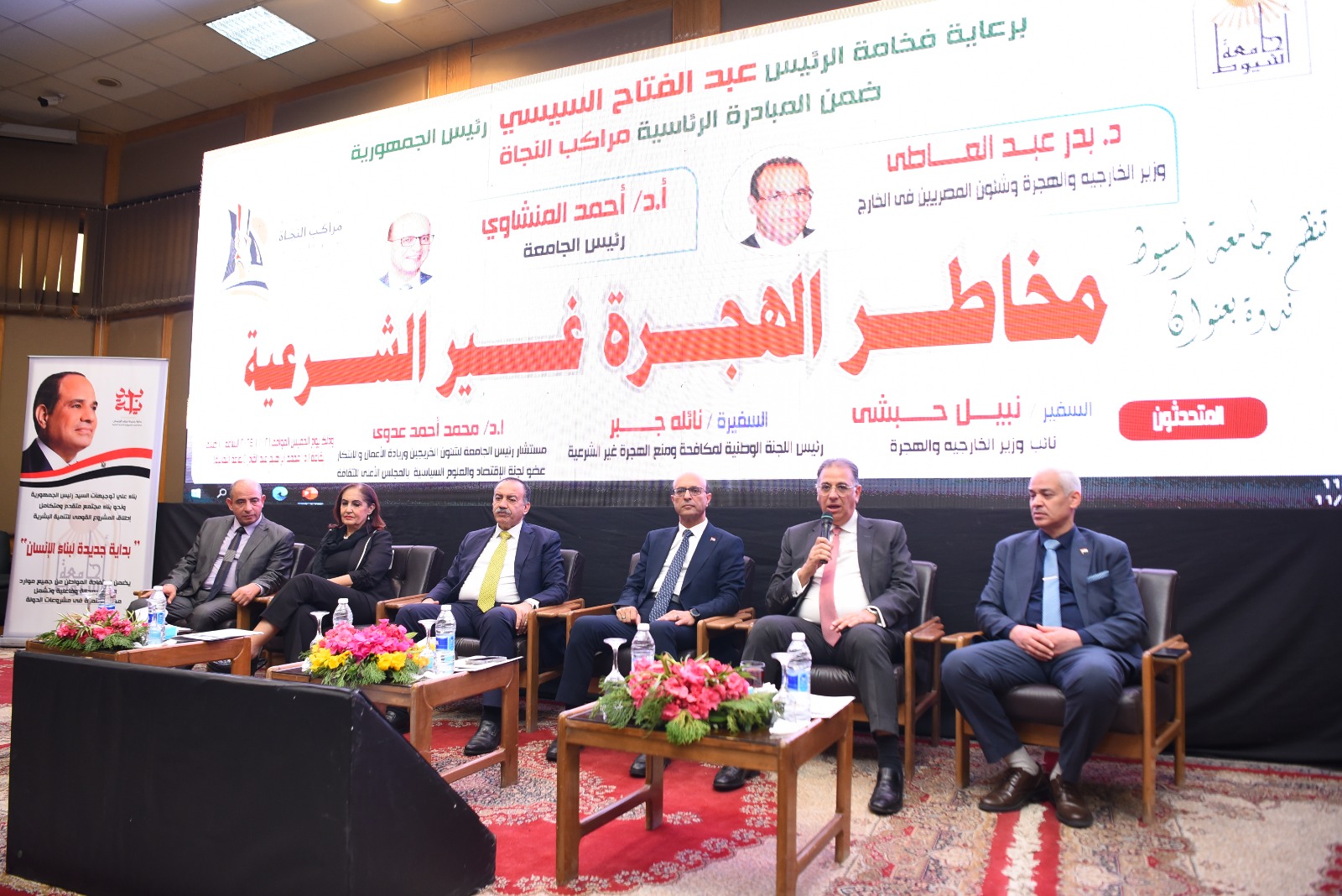 The seminar was opened by prof. Ahmed El-Minshawy, president of Assiut University, and Major General Hisham Abu Al-Nasser, governor of Assiut, and lectured during it; Ambassador Nabil Habshi, Deputy Minister of Foreign Affairs, Immigration and Egyptians Abroad Affairs, and ambassador Naila Gabr, chairman of the National Coordinating Committee to combat and prevent illegal immigration and human trafficking, in the presence of Dr. Ahmed Abdul Mawla, vice president of the University for Education and Student Affairs, and Dr. Mohamed Adawi, advisor to the president of the University for alumni affairs, entrepreneurship and innovation, and a member of the economics and political science committee, at the council in addition to the executive and popular leaders, members of the University Council, deans, proxies, faculty members of the University's faculties, and a crowd of students.