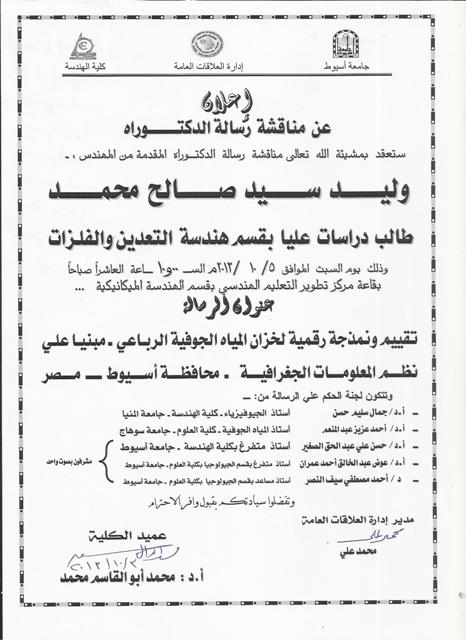 The mining and metallurgical engineering department has approved to form a jury committee to evaluate the PhD thesis proposed by eng Waleed Saleh Sayed Muhammad on Saturday 5-10-2013 at 10.00 a.m. in the education development center in the mechanical department.