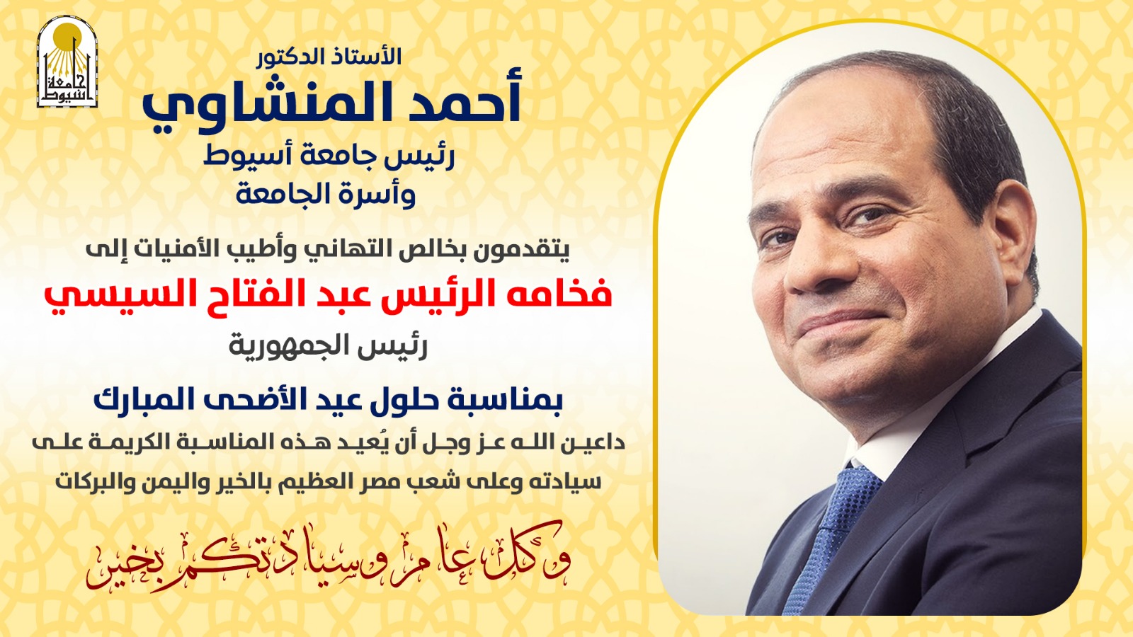 With pride and pride, Professor Dr. Ahmed El-Minshawy, president of Assiut University, sent his congratulations and best wishes to His Excellency President Abdel Fattah al-Sisi, president of the Republic, on the occasion of the Blessed Eid al-Adha.