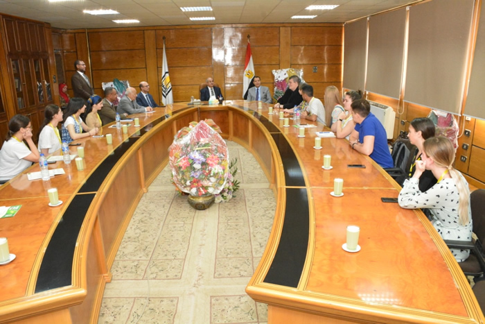 Assiut University President received a student delegation from the Russian University of Petagorsky, under the supervision of Dr. Denis Mirgorov, Professor of Political Science, Dr. Natalia Sharp Arvo, Professor at the Faculty of Education, Petagorsky University in the presence of Dr. Shehata Gharib, Vice-President for Education and Student Affairs, Dr. Ahmed El-Menshawy, Vice-President for Graduate Studies and Research, and Dr. Hassan Abdel-Hamid Soliman, Coordinator of University Relations with the Universities of the Russian Federation and Director of the Center for Teaching Russian Language.