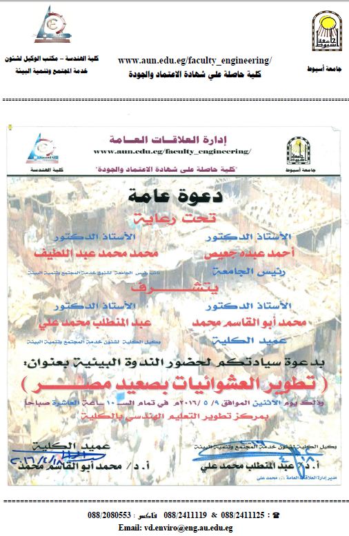 The faculty of engineering will hold a symposium about Developing Slums in Upper Egypt on sunday 9-5-2016 at 10:00 a.m. in the Education Development Center.