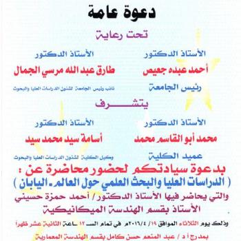 The faculty of engineering will hold a lecture about Postgraduate Studies and Scientific Research in Japan on Tuesday 19/4/2016  at 12:00 in professor/ Abd El-Moniem amphitheatre in the…